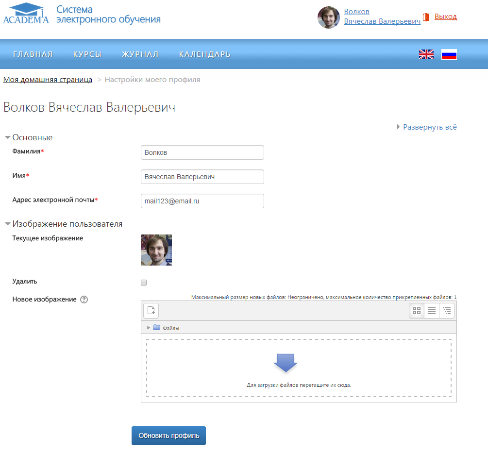 «Новое изображение» — чтобы добавить новое изображение выберите его (в формате JPG или PNG) и нажмите «Обновить профиль». Изображение будет обрезано до квадрата размером 100х100 пикселей.