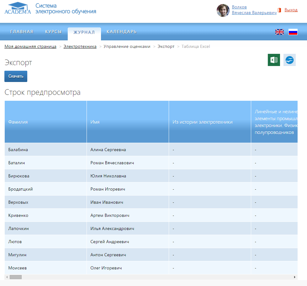 Рис. 121. Страница предпросмотра таблицы экспорта отчета по оценкам в формат Excel