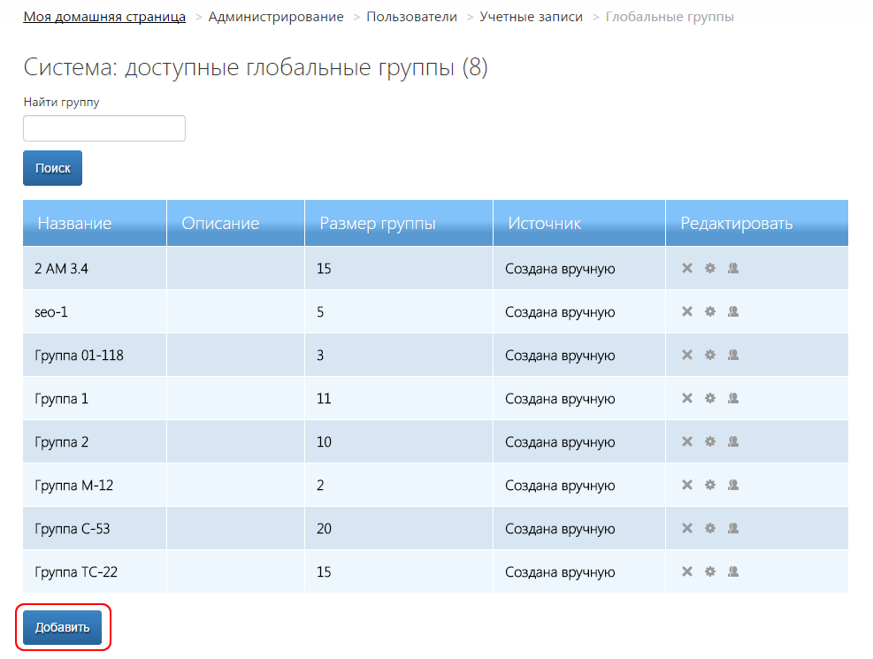 Для того чтобы добавить учебную группу, нажмите на кнопку «Добавить» на странице «Глобальные группы» (рис. 130).